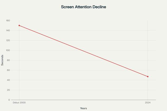 Évolution de la durée d’attention moyenne face aux écrans (2000-2024)